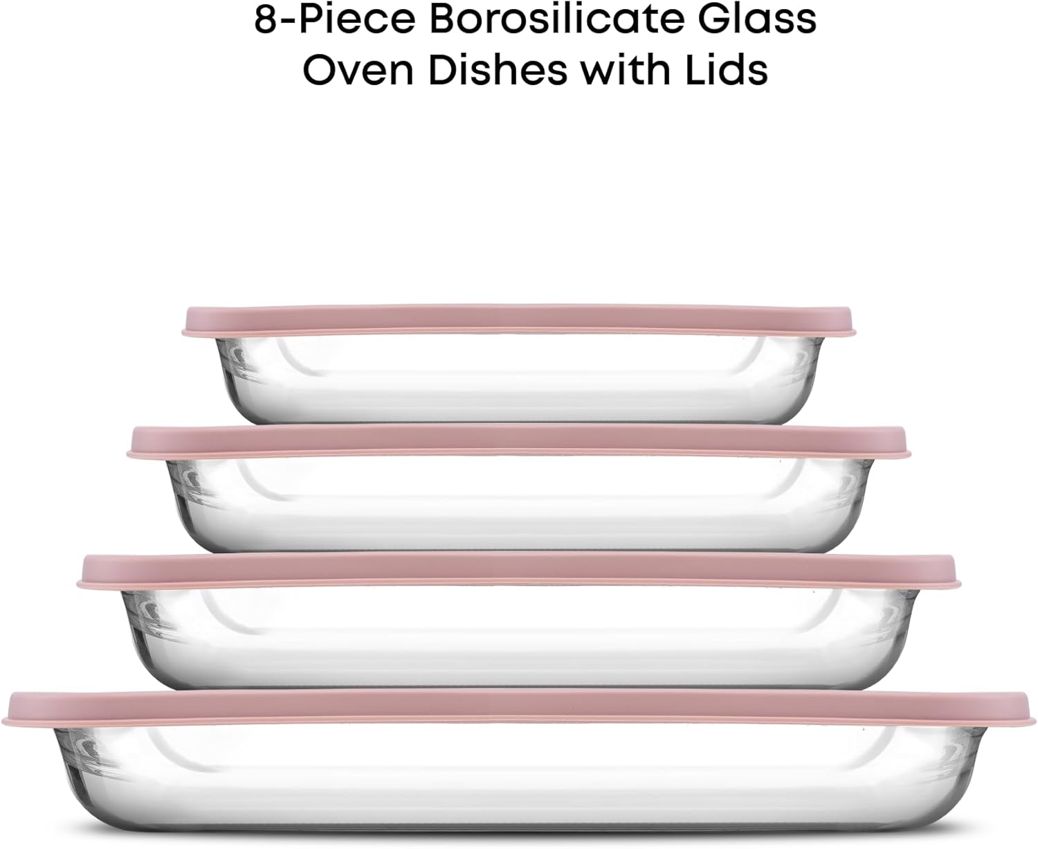 JoyJolt 8-Piece Borosilicate Glass Oven Dishes with Blushy Pink Lids, Rectangle Deep Glass Baking Dish Set, Baking Pans for Lasagna Casserole Cake, Bakeware Set, Freezer to Oven Tray to Dishwasher