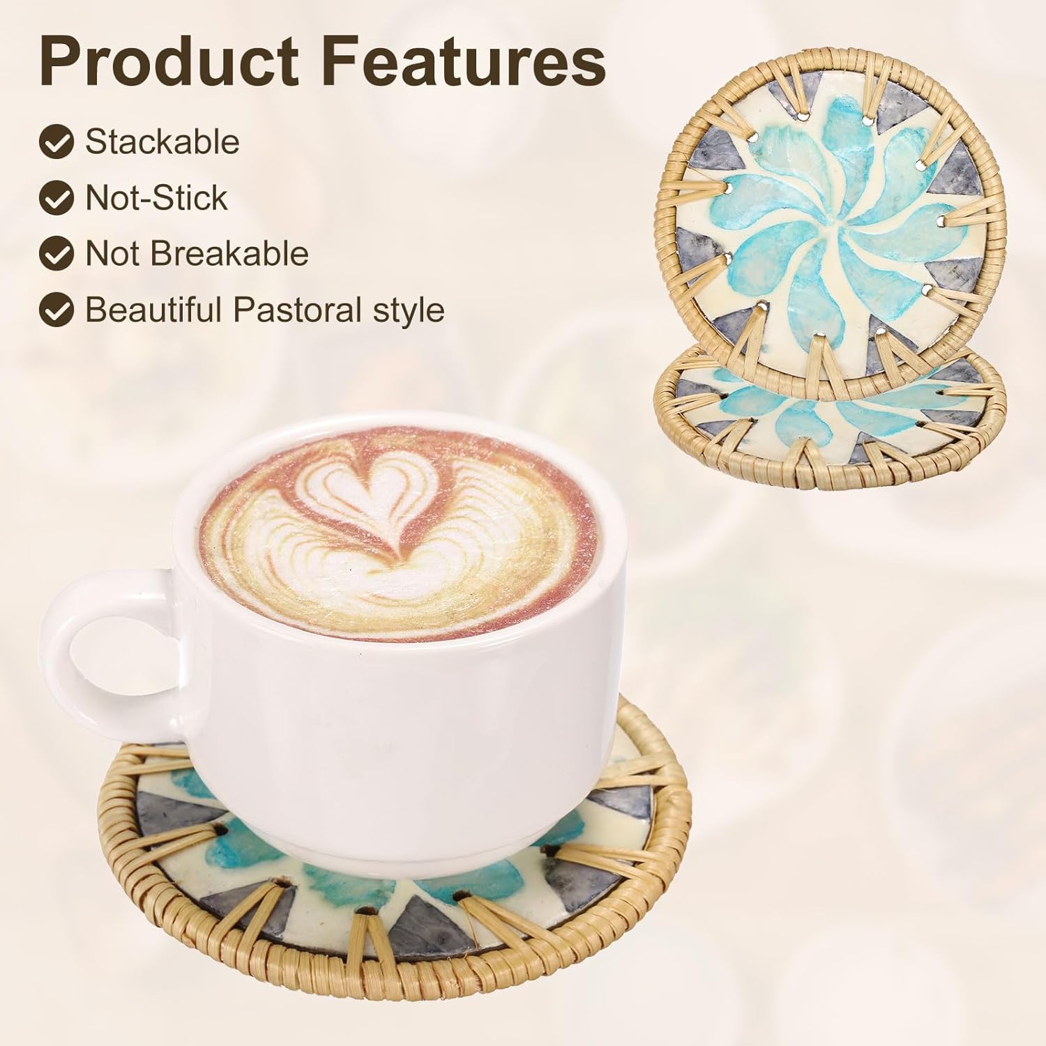 - Material: These handmade coasters are made of rattan weaving. The special and exquisite craftsmanship makes the surface smooth, the texture delicate, the touch comfortable, and has a certain toughness, which is not easy to be scratched or deformed during use
