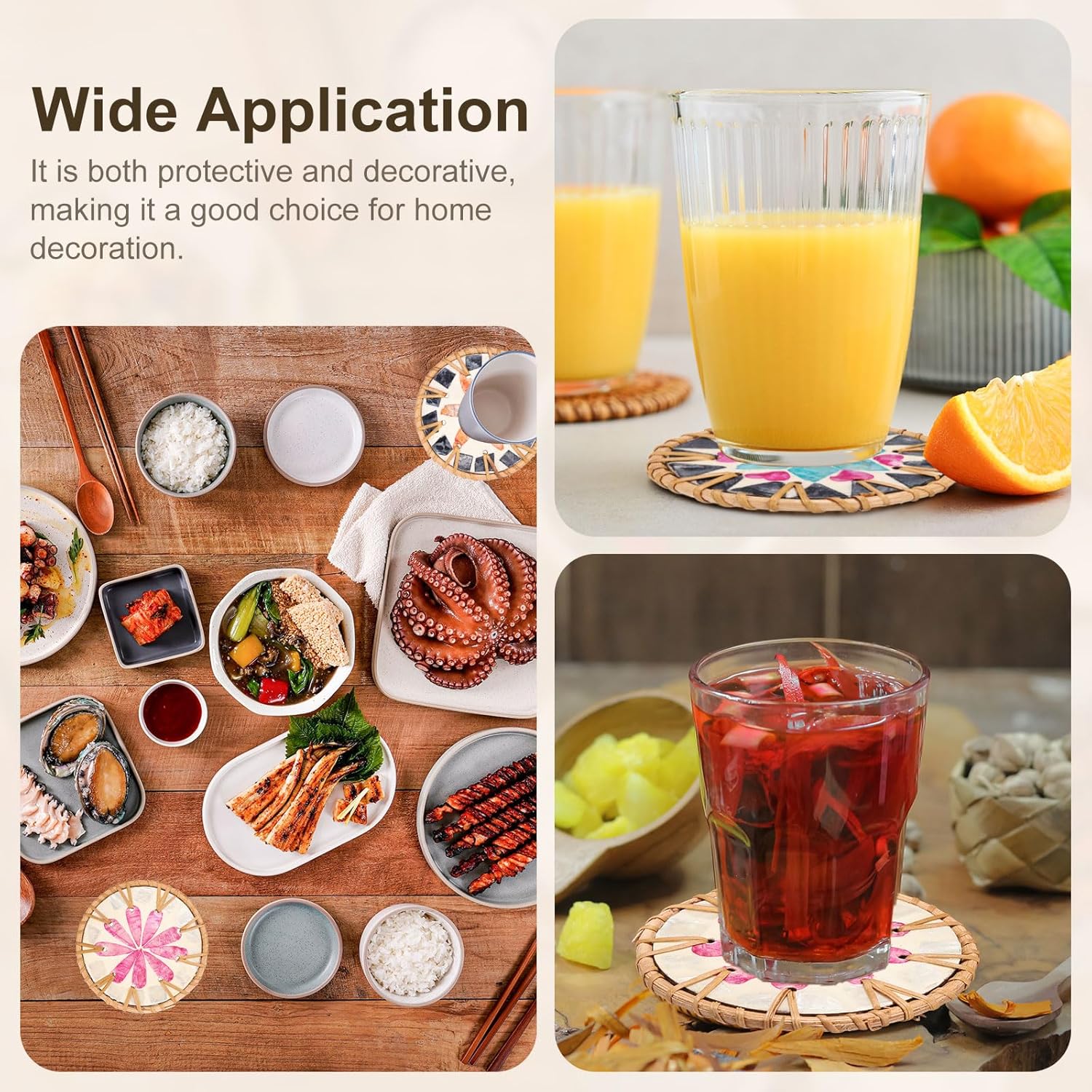 - Effective Protection: The appropriate thickness of the coaster can not only effectively insulate and protect your dining table and coffee table from high temperatures, but also reduce the noise caused by the drink cup hitting the table when placed on it, creating a quiet environment. The bottom has a non-slip effect to ensure that the cup is placed stably and reduce the risk of slipping