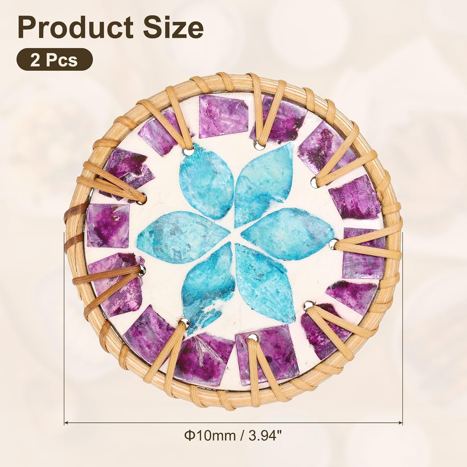 - Package and Size: Diameter: 10cm / 3.94inch; Package Content: 2 Pcs x Woven Rattan Coasters.The photo may have slight color difference, please refer to the actual product