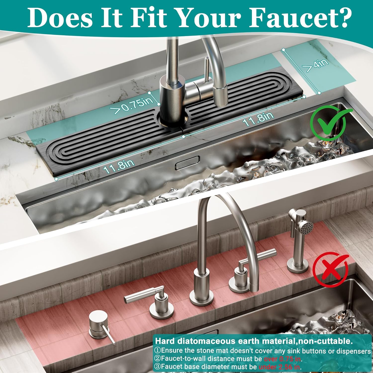 - 【Perfect For Most Faucets】MAGKOTA Stone faucet mat for kitchen sink available size(L x W):20 x 4",23.6 x 4" and 30 x 4", Center Hole Diameter 2.56", ensuring a precise fit around most standard faucets.★Ensure kitchen sink mat won't cover any sink buttons,dispensers or controls based on your sink size★The distance from faucet to wall must be more than 0.8 inches★ Faucet base diameter must be less than 2.56 inches★Tip: Please measure countertop space around your faucet to ensure compatibility.