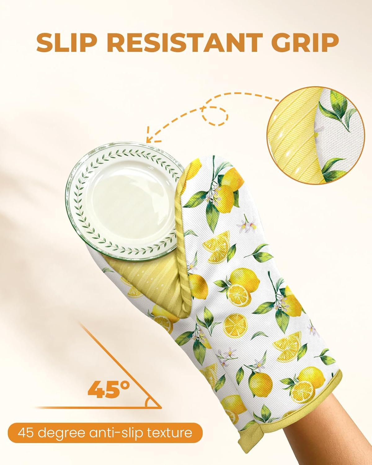 Slohif Lemon Mini Oven Mitts Set – Yellow Extended Short Heat Resistant Kitchen Gloves for Women, 100% Cotton Oven Mitts with Silicone Grips, Non-Slip and Thick Durable for Cooking & Baking