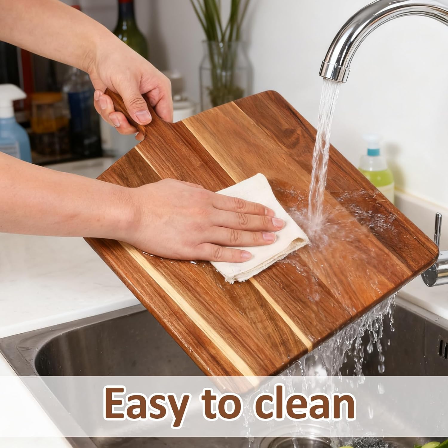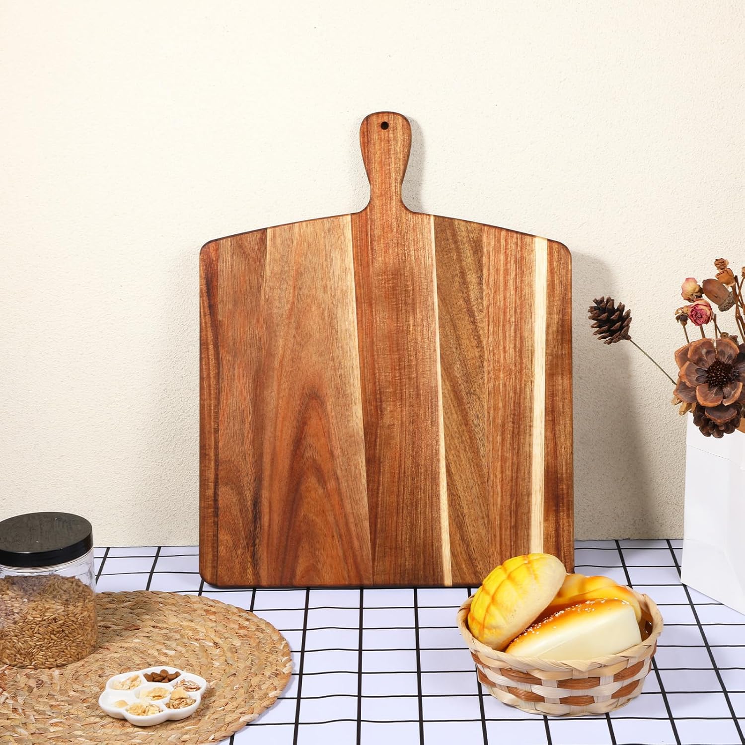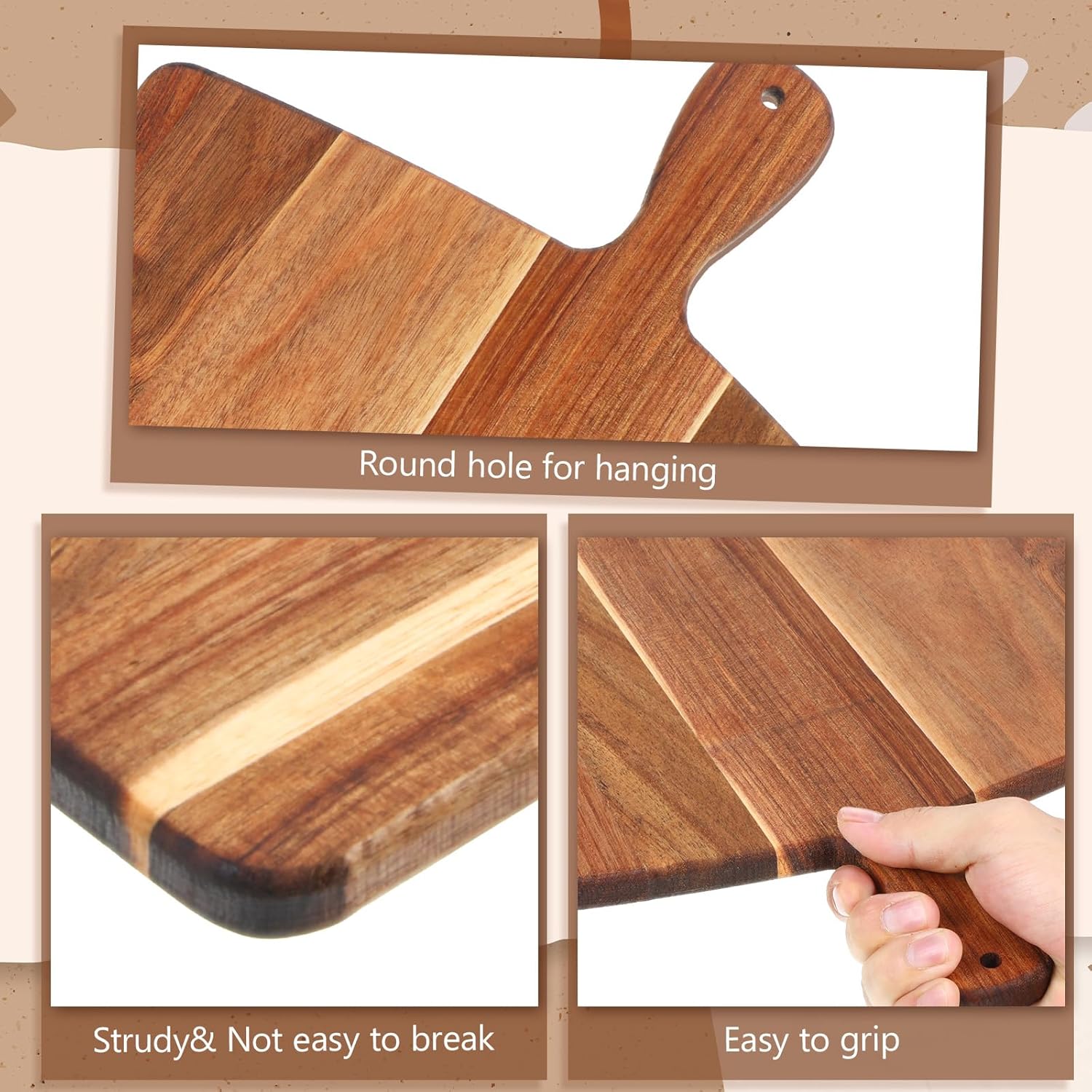 - Convenient Handle & Storage: Equipped with built-in handles, it’s easy to transfer chopping ingredients to pots/pans or carry charcuterie to the table. The design also allows for hanging storage (via handle holes), saving cabinet space while turning the board into a decorative wall accent. The handles enhance practicality without sacrificing aesthetics