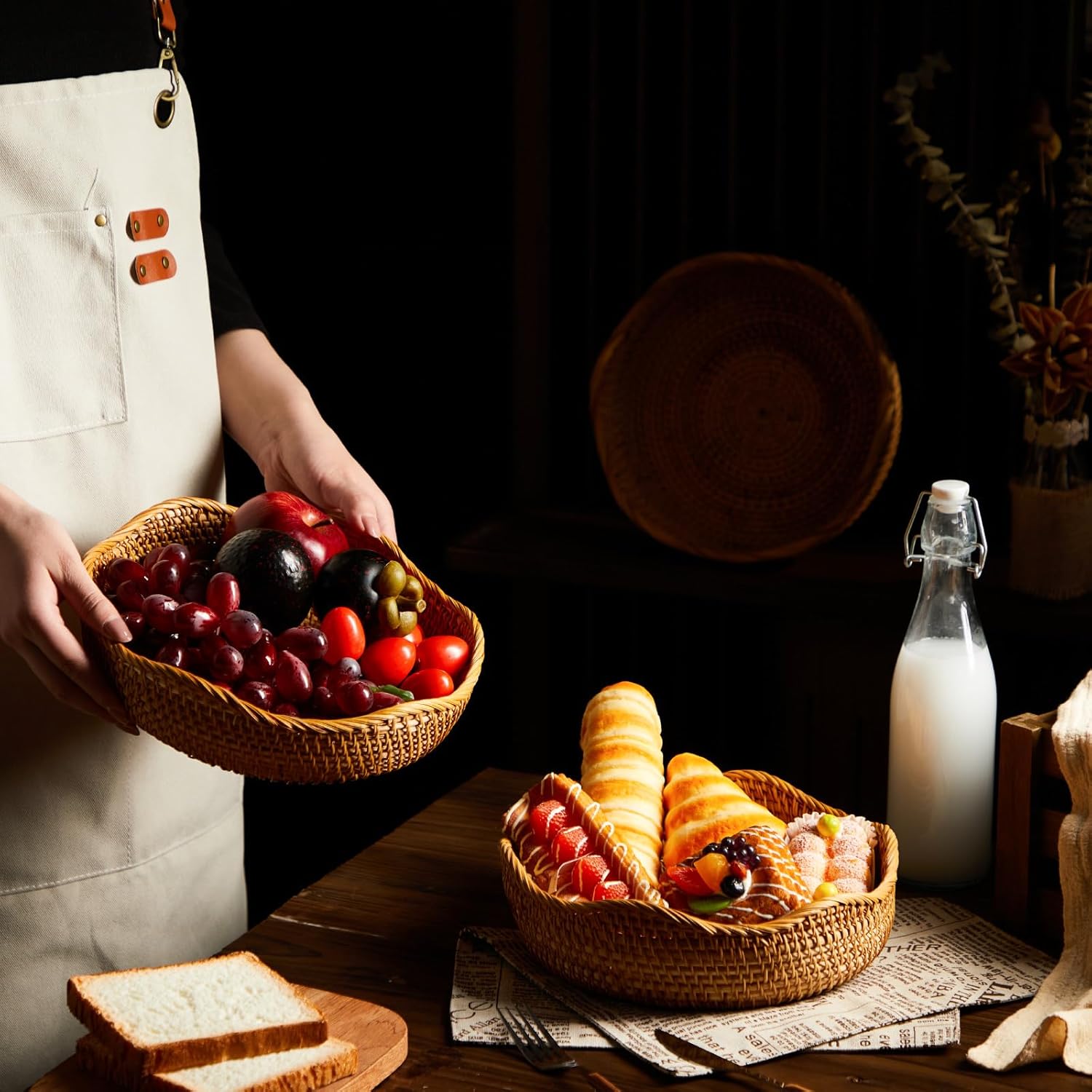 - Natural Rattan Material: our small baskets are crafted from quality rattan materials; This allows them to withstand constant use and carry diverse items like bread, fruits, keys; Without worrying about breakage or wear and tear, this material ensures that you will enjoy their service for a long time and clean easily with a damp cloth
