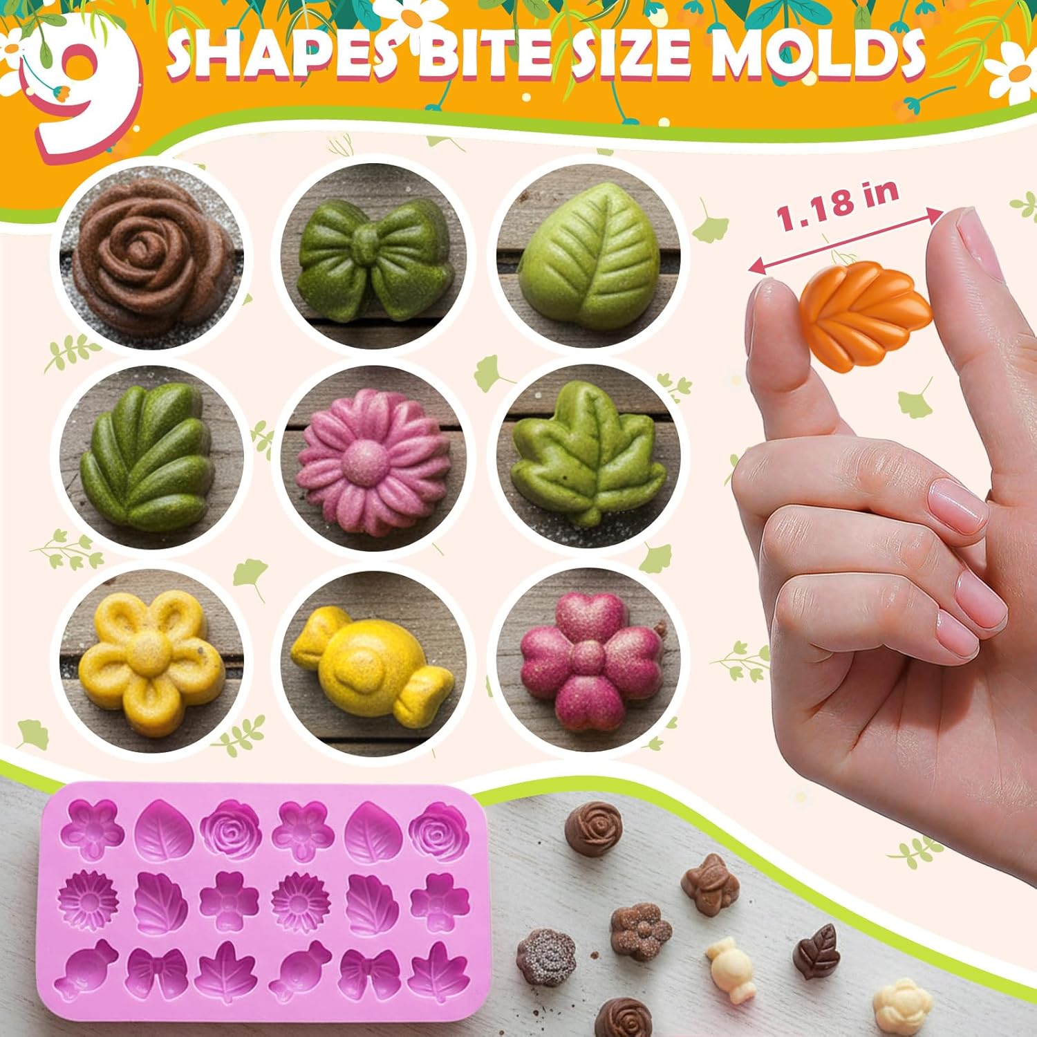 HKNMTT Flower Candy Molds Silicone, Small 9 Shapes Bite Size Chocolate Gummy Jello Gelatin Spring Cute Bow Rose Leaf Dessert Wax Melt Ice Cube Moulds Food Grade Treats Making Oven Safe Kids DIY Set