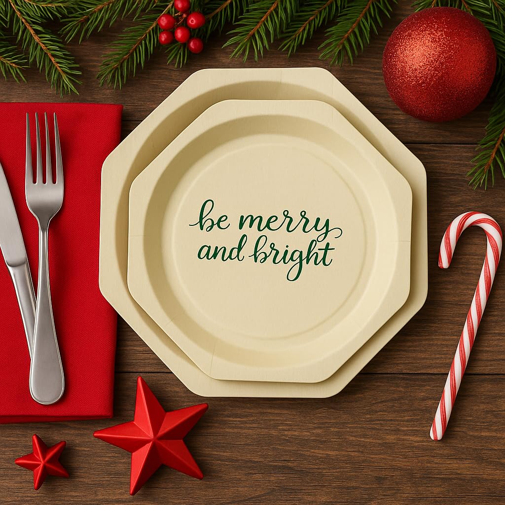Perfectware Disposable Wooden Christmas Plates, 10.2 Inch Octagon Shape, Be Merry and Bright Green Print, 25 Count
