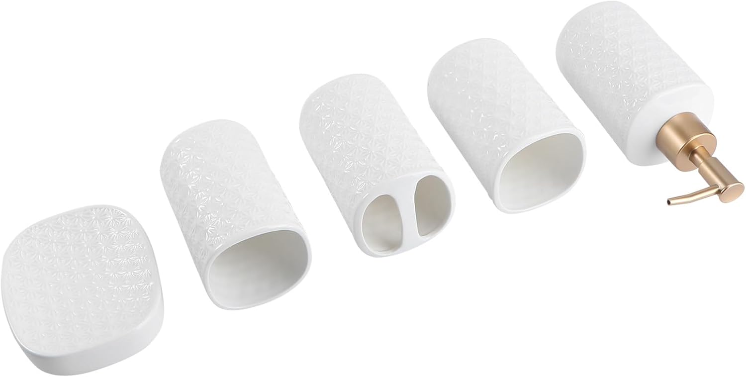 Wakauto Ceramic Bathroom Washing Accessory Set White Including Soap Plate Lotion Container Toothbrush Cup for Bathroom Organization and Space Saving